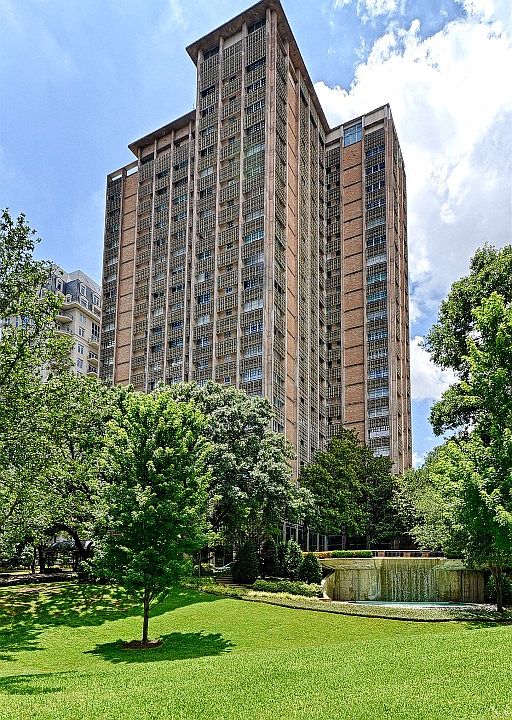 Located in iconic 3525, designed by mid-century modern architect Howard Meyer. This unit was once owned by famous, Academy award winning actress, Greer Garson. Spacious one-bedroom condo for full-time residence or pied-a-terre. Beautiful sunset views from the enclosed terrace, light hardwood floors in the living, dining and kitchen areas. Living room has a built-in Murphy Bed. Granite counter tops with original mid-mod metal Crane kitchen cabinets. Large bedroom with walk-in cedar closet and two additional closets. One closet converted into a cozy work space. Bath has walk-in shower and separate garden tub. Floor to ceiling windows and ample storage throughout the home. Grass wallpaper offers neutral light tone throughout the condo. Walking distance to restaurants, entertainment districts, Katy Trail, Turtle Creek Park and more. Two parking spaces will be assigned by board and management company. One indoor storage unit.