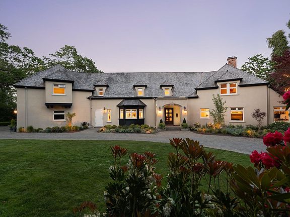 Originally built in 1929, this beautifully updated home sits on over half an acre in the highly desirable Uplands neighborhood. Surrounded by mature trees and well-maintained gardens, it offers a unique blend of classic character and modern comfort, ideal for family living. The 2022 kitchen renovation includes quartz counters, custom cabinetry, a large island & high-end appliances. Enjoy spacious living and dining areas, a bright conservatory, and a vaulted family room with a fireplace. Upstairs features a large primary suite with two walk-in closets and ensuite, plus four more bedrooms (two with ensuites), some with ocean views. The lower level includes a media room, guest room, bath, and full laundry. Extras include hot water heating, a hot tub, EV charger, and sunny patios. Located within walking distance to the University of Victoria, Uplands Golf Club, Royal Victoria Yacht Club, and Gyro Beach, this home offers timeless charm, modern updates, and an ideal setting for family life.