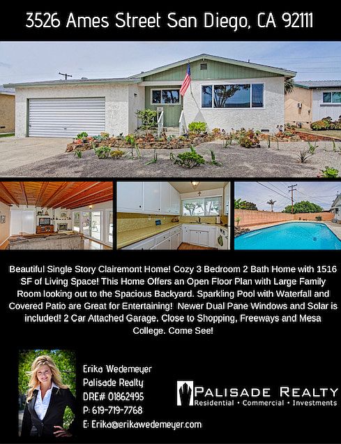 This 1516 square foot single family home has 3 bedrooms and 2.0 bathrooms. This home is located at 3526 Ames St, San Diego, CA 92111.