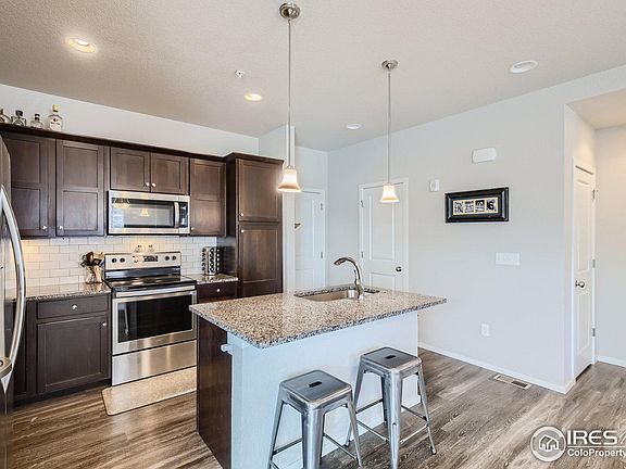 Move-in ready end unit townhome style condo with finished basement and attached two car garage! Built in 2018 by Hartford Homes yet located in a well established western Fort Collins location near the base of the foothills. The main level offers an open floor plan with luxury vinyl plank throughout and an upgraded kitchen including stainless steel appliances, pendant lights over the island, espresso alder cabinets with shaker style doors, subway tile backsplash and granite countertops. Upstairs, the spacious primary suite features a bathroom with double sinks, oversized tiled shower and walk-in closet. Two additional bedrooms, each with their own walk-in closets, a full bathroom and laundry room complete the upper level. A fourth bedroom, 3/4 bathroom and recreation room are located in the finished basement. Relax on the covered front patio or take advantage of the side patio off the dining area for extra space. Convenient location near trails and parks!