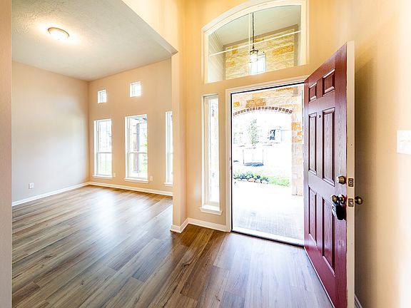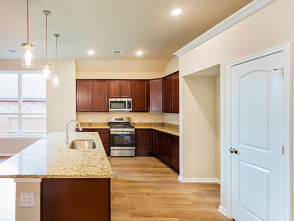 Stunning granite countertopsUpgraded covered patioTexas size islandWelcoming front porchCustom cabinetsSpacious secondary bedrooms