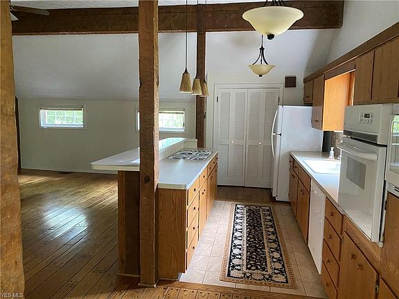 Nestled back off the main road, on over 3.6 acres, this beautiful home offers an open kitchen with eat-in area with appliances included additional dining room. Vaulted ceilings, great room with fireplace, first floor master with master bath and 2 additional spacious bedrooms with full bath upstairs. A bonus/recreational area with fireplace on lower level. Revere Schools. Lawn care included in rent!