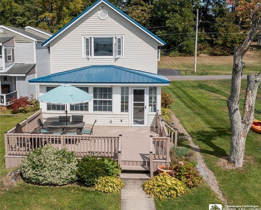 Here is your chance to own a piece of Chautauqua Lake heaven. This beautifully maintained, fully furnished, year-round lakefront home is waiting for new memories to be made. This renovated charmer is virtually maintenance free with vinyl siding, metal roof, new tankless water heater, and low BPU electric bills. Entering the home, you will immediately feel the stress leave as you walk into the sun-filled rooms and see the fantastic lake views. The kitchen is updated and well appointed, boasting beautiful butcherblock countertops, clean white subway tile back splash and stainless steel appliances. The living room is spacious and where you will find incredible hardwood floors both downstairs and upstairs. The Laundry room and half bath are conveniently located on the first floor. Walk out to your own personal dock, through a beautiful sun porch and spacious newly stained deck. The back deck is maintenance free Trex. Upstairs you find two bedrooms and a full bathroom. The main bedroom faces the lake so you will wake up to the most beautiful views, out of the large picture window. The attached garage and parking spots on the other side of the road gives ample space for parking. You will always have plenty of elbow room and unobstructed views since the adjacent lot will remain open and undeveloped. The location is perfect in order to enjoy all the attractions and amenities of the Lake, Bemus Point, Jamestown and more. A family home or possibility of an investment property, you chose, but don't wait. Come and see for yourself- you will fall in love.