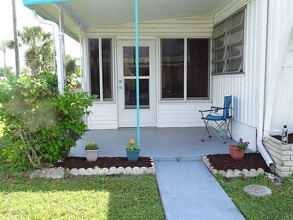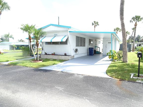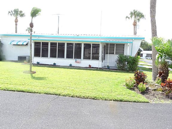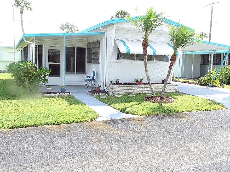Come take a look at this freshly painted mobile, the mobile sits in a very desirable mobile home park the lot rent is fair market at 472.00 monthly. Palm Village has a swimming pool, clubhouse, shuffleboard, a dog walk, and lots of activities. This is a well-kept park with lots of pride of ownership. The mobile home is a one bedroom one and a half bath. With a beautiful large glass and screen Florida room. the living room is nice-sized and has three large windows for that Florida natural lighting, the floor has been recovered with wood laminate flooring throughout home. The kitchen has brand new back splash lots of cabinets and a newer refrigerator. Down the hallway you will find the main bath that has a tub shower combo, a comfort height commode and it was also recovered with laminate flooring. Behind that you will find the master bedroom that is of nice size that has built-in dresser, and two closets and houses the half bath. Outside you'll find an oversize shed a nice carport that will accommodate two cars. And all this home sits on a corner lot giving you a little extra privacy. Don't sit on this one as The Price is Right come add your touches and you will have a very nice home.