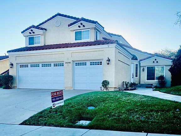 35285 Prairie Road is in the community of Windsong Valley, in Wildomar. When you enter this beautiful home you will be impressed with how light, bright and open the floor plan is. Spacious living room and dining room with cathedral ceilings and lots of oversized windows overlooking the back yard. Just off the living room dining room area is the kitchen with white cabinets, stone counter tops, stainless steel appliances and a breakfast nook area. The kitchen is open to the family room with a fireplace, laminate flooring and a door to the back patio. 1/2 bath is down stairs across from laundry room and there is direct garage access. Upstairs is a large master bedroom with an adjoining master bathroom with a soaker tub, a two sink vanity, shower and a walk in closet. There are two additional bedrooms upstairs and a full bathroom. Close access to 15 fwy for commuting. Landscaping included We look Forward to meeting you!