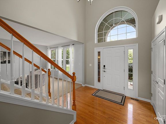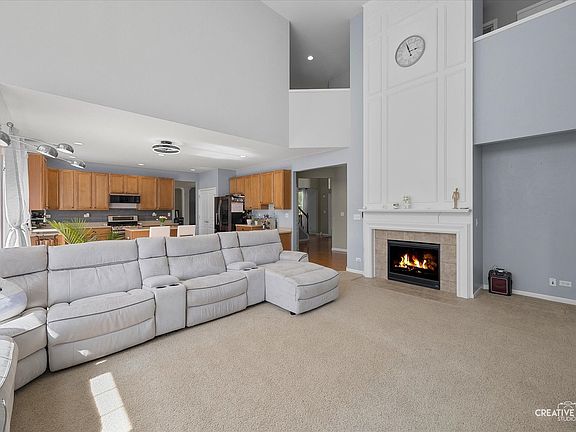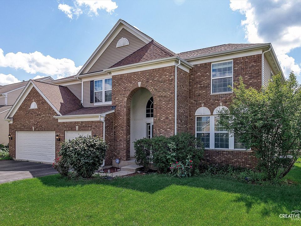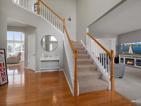 Welcome to this striking partial-brick home where expansive ceilings and a grand, sweeping staircase set the tone the moment you enter. To the right, a bright sitting room opens to a formal dining room perfect for gatherings. To the left, a convenient powder room and hall lead to the show-stopping great room: a well-lit space with 20-foot ceilings and a cozy fireplace. The open layout flows into an eat-in kitchen featuring granite countertops, stainless steel appliances, abundant cabinetry, and an informal dining area. Upstairs, the spacious primary suite includes an ensuite bath with separate shower and soaking tub. Three additional, well-sized bedrooms share a generous full bath. A dramatic overlook from the second level views both the foyer and the great room below. Everyday practicality shines with a 3-car garage that enters into a combined mud/laundry room. Mechanical upgrades include a tankless water heater and newer dual furnaces & A/C. Outside, enjoy an entertainer's dream patio with built-in fire pit-perfect for evenings with friends.