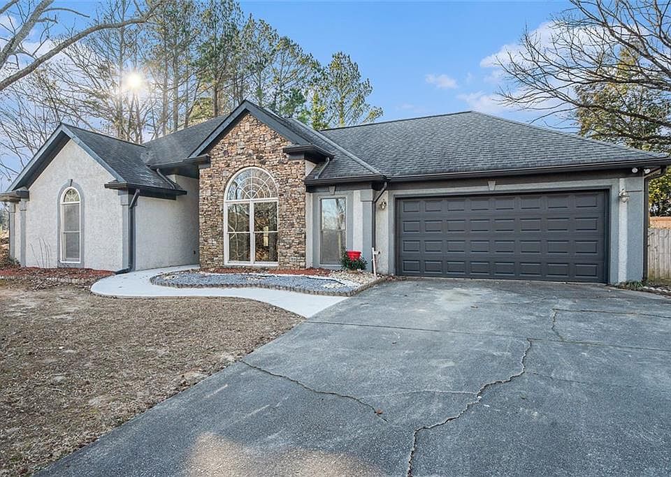 Enjoy the quiet life at the end of the cul-de-sac with this refurbished 3 Bed 2 Bath Ranch with a stucco facade and stacked stone framing an elegant palladium window. Wide-plank hardwood floors throughout with high ceilings in the large open floor plan. Dramatic wooden beams frame the family room and separate dining room as you enter. The fireplace in the family room is framed in stacked stones for cozy gatherings. The kitchen has granite counters and SS appliances. The fridge has clean lines with double doors on top and two freezer drawers below. The kitchen has a view to the family room and the breakfast bar. There’s also a separate breakfast area with views to the backyard. The large walk-in pantry also houses the laundry. As you head toward the primary suite, there is a library/office area off the family room. The large primary suite has a double trey ceiling and fan, the ensuite bath has double vanities, whirlpool tub, and separate shower. The two other bedrooms have fans, and one has a vaulted ceiling. There is a large sunroom leading to the fenced back yard. The interior has been freshly painted and in January the home will be attached to the city sewer line and no longer using the current septic tank. There is a community pool in the subdivision. In the Seckinger High School district not far from I85 and the many entertainment opportunities near the Mall of Georgia. Seller is providing a one year Standard 2-10 Home Warranty covering appliances, electric, and plumbing support.