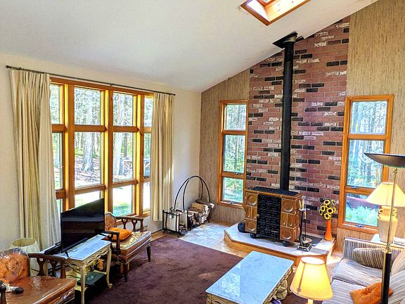 Small streamPrivate surveyed acresAbundant skylightsCathedral ceilingsWeso ceramic multi-fuel woodstove