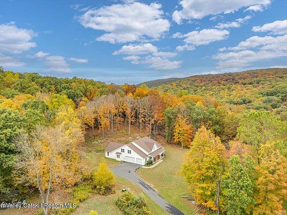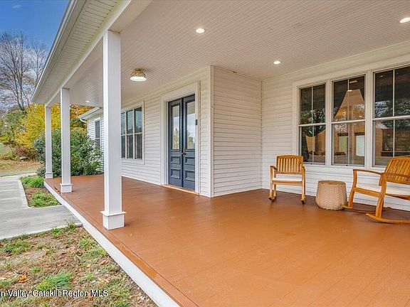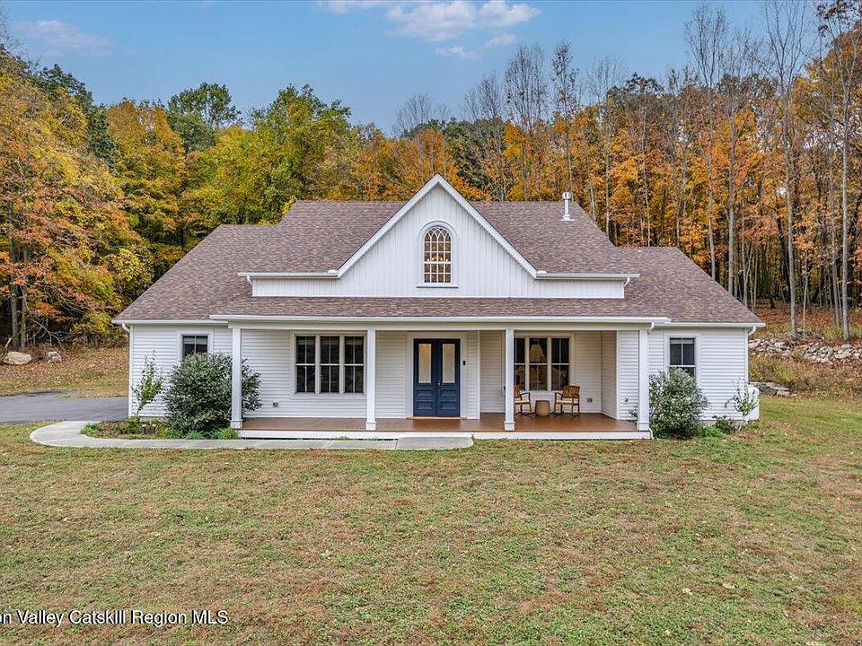 A Timeless Farmhouse Retreat with Modern Elegance. Step into refined country living with this brand-new, bespoke farmhouse ranch, where Old World charm meets contemporary craftsmanship. Gracefully set on over five private, serene acres, this four-bedroom, three-and-a-half-bath home invites you to savor a lifestyle of quiet sophistication and natural beauty. A dramatic 20-foot entryway ceiling welcomes you with an antique stained-glass window, setting the tone for a home where curated history and modern comfort intertwine. Wide-plank hardwood floors, soaring 9-foot ceilings, and sun-drenched Anderson windows carry you through a light-filled open floor plan, designed for effortless entertaining and everyday elegance. The heart of the home is a chef's kitchen, beautifully appointed with quartz countertops, Café series appliances, a farmhouse sink, and a custom range hood. An antique hutch and a walk-in pantry with custom cabinetry offer both charm and function, while French doors in the dining area lead to a covered patio—ideal for al fresco gatherings. The living room is anchored by a gas fireplace with a hand-hewn antique wood mantel and exposed beam, creating a warm, inviting ambiance. A refined powder room, mudroom with garage access, and an oversized laundry suite with built-in storage elevate everyday living. The primary suite is a true sanctuary, featuring a vaulted ceiling, private access to the patio, a custom walk-in closet, and a luxurious spa bath with a freestanding soaking tub, walk-in shower, water closet, and heated floors. Two additional bedrooms and a full bath complete the main level. Upstairs, a spacious media room leads to a fourth bedroom with a walk-in closet and a private en-suite bath—ideal for guests or an au pair suite. Thoughtful details abound: Therma-Tru doors, foam insulation, on-demand hot water, and antique accents throughout. The home also features a three-car attached garage and a wide front porch with Douglas Fir decking, perfect for morning coffee or evening sunsets. Ideally located with convenient access to I-84, Taconic State Parkway, and the Metro-North train, this exceptional residence offers country living with seamless connectivity. Brand new Tesla electric car charger installed.