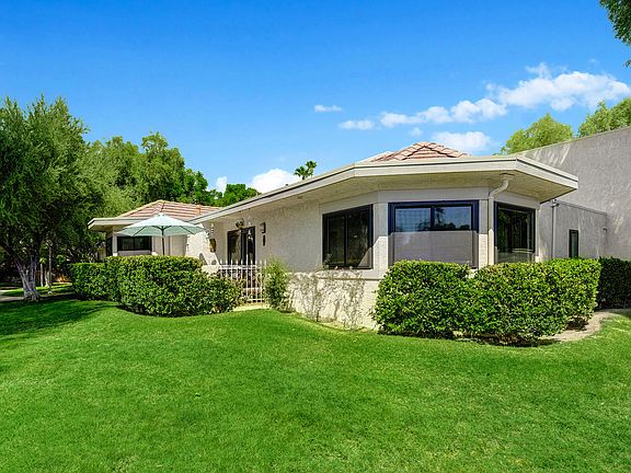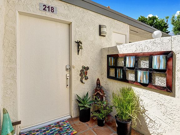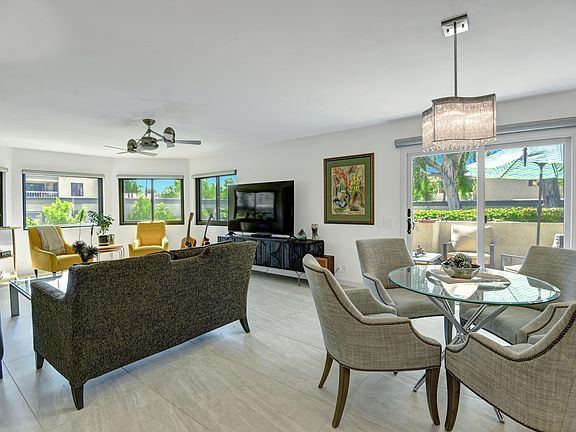 A must see! Seldom available ''bungalow-style'' condo which shares only one wall, all on one level, with no unit above or below. Over $140,000 spent on interior renovations within the last year including: new kitchen with stainless steel GE Cafe suite of appliances with double ovens, granite countertops. New bathrooms, new flooring throughout, new double-paned Anderson windows and sliders throughout, custom window blinds, new interior doors, and more. Great separation between bedrooms, both ensuite, with California Custom Closets. New HVAC ductwork throughout. Open floorplan between kitchen, dining, and great room with large bank of bay windows. Inside closet stacked washer and dryer. Easy access to Uptown Palm Springs' restaurants and coffee houses. Beautifully ''turnkey furnished'' per inventory. Rental minimum is 30 days. You own the land. List of upgrades attached.