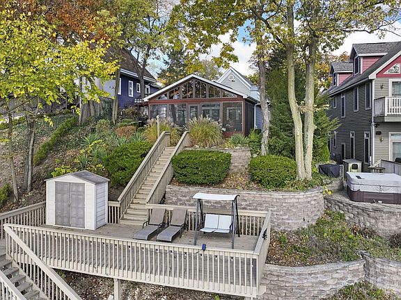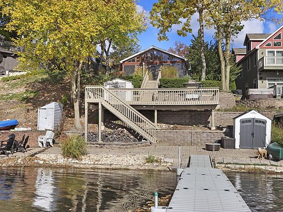 Amazing lakefront screened-in porch is one of several outdoor spaces to enjoy the stunning views of Lake Mary. With 50' of shoreline, you can swim, boat, or relax on your private pier. A lakeside deck is perfect for sunbathing or outdoor dining. This home features 5 bedrooms and 3 baths, with an open main level offering 2 bedrooms. The 2-car garage and large driveway provide ample parking. The upper-level main suite includes a private balcony with lake views and an en suite with a separate tub. A whole-house generator is included. Lake Mary is an all-sport, spring-fed lake ideal for skiing, fishing, swimming, and enjoying natural beauty, just minutes from Lake Geneva and Wilmot Mt.