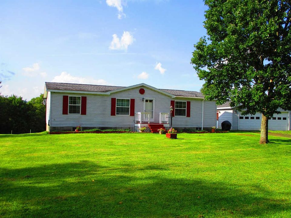 One Level living in this 3 bedroom 2 bath RANCH home on a full foundation with a 2 car detached garage and almost an acre of land surrounded by pastures! Walk in from the side deck and find a mud room/ breakfast nook with laundry on the side and an open concept with kitchen, formal dining room and living room. On one side are 2 bedrooms and a full bath and the master along with master bath on the other. Upgrades include recessed lighting, replacement windows, newer furnace, new hot water tank, new pressure tank for the well and extra insulation to keep your heating bills LOW!There is a full walk out basement with french doors which could easily be finished for additional living space. Walk out the french doors to the back yard with a fenced in kennel for your pets. There is plenty of green pastures surrounding the property for privacy.