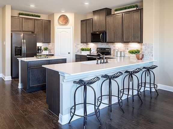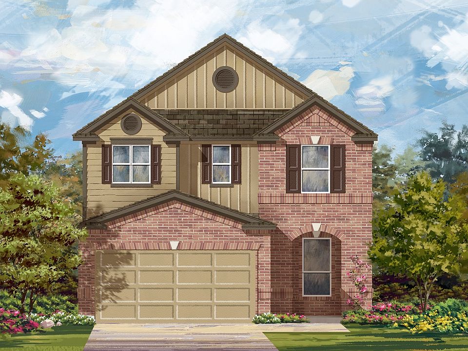 This beautiful two-story open floor plan features airy 9-ft. first-floor ceilings, a spacious great room and a den ideal for a home office. The roomy kitchen showcases Woodmont flat-panel maple cabinets in White, Silestone® countertops in Blanco Maple and tile backsplash. Upstairs, a loft provides space for a media or study area. The master suite offers a large walk-in closet and connecting bath that boasts Silestone® countertops, a dual-sink vanity, garden tub and separate shower with tile surrounds. Additional features include plush Shaw® carpeting at loft and bedrooms, tile flooring at baths, Armstrong® vinyl plank flooring at entry, great room, kitchen and den, Sherwin-Williams® low-VOC interior paint in Alabaster, Generation Lighting fixtures, JELD-WEN® Camden® 2-panel interior doors, a full yard sprinkler system and smart thermostat. Relax and entertain outdoors on the extended back patio.