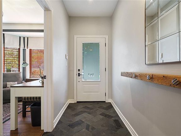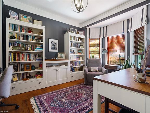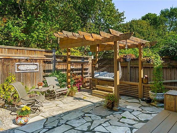 This Fabulous Freehold is a Dundas Downsizer’s Dream, combining modern sophistication with an unbeatable escarpment backdrop. Rarely offered, this high-end residence holds the perfect balance of comfort, style, and convenience, all within walking distance to downtown, the Dundas Valley Golf and Curling Club, conservation trails, schools, and parks. From the moment you arrive, the curb appeal impresses with manicured landscaping, an interlocking stone drive, and a single-car garage with inside entry. Inside, every detail has been thoughtfully designed with exquisite fixtures and finishes throughout. The welcoming foyer with slate floors opens to an expansive open-concept kitchen, dining, and living area, all set under soaring cathedral ceilings. The chef-inspired kitchen features sleek black cabinetry with designer hardware, white quartz countertops, stainless steel appliances, an island breakfast bar with pendant lighting, and a sidebar offering extra storage. The dining space is highlighted by a dramatic exposed beam at the peak of the ceiling, while the living room invites relaxation with a custom built entertainment unit, a stunning fireplace wall, and walk-out access to the private backyard. The main floor continues with a serene primary suite featuring a walk-in closet and a spa-like 3-pc ensuite, along with a versatile second bedroom complete with a south-facing bay window, custom bookcase wall, and built-in desk—ideal for guests or a home office. A second 3-pc bath and a convenient laundry room with pantry storage complete this level. The fully finished lower level extends the living space with a generous family room, third bedroom, 2-pc bath, dedicated office area, utility room, and workbench/storage room. Outdoors, the private yard is a true retreat, with a recently stained deck, pergola with swing, stone walkway, and breathtaking escarpment views framed by mature trees—a tranquil, low-maintenance oasis perfect for entertaining or unwinding in nature.