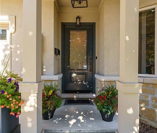 Manicured landscapingInterlocking stone driveExquisite fixtures and finishesSoaring cathedral ceilingsChef-inspired kitchenSleek black cabinetryWhite quartz countertops