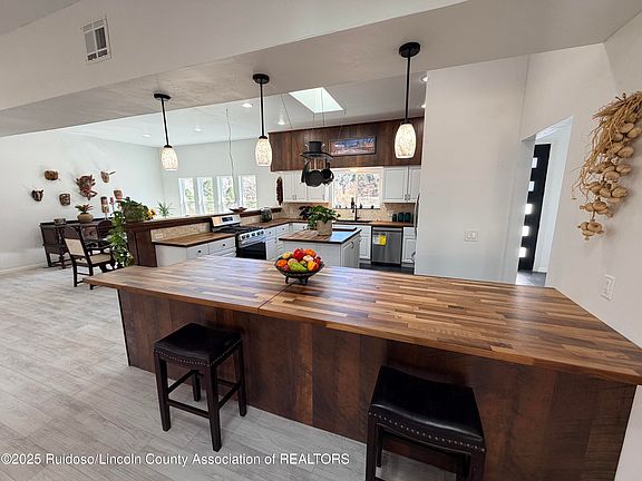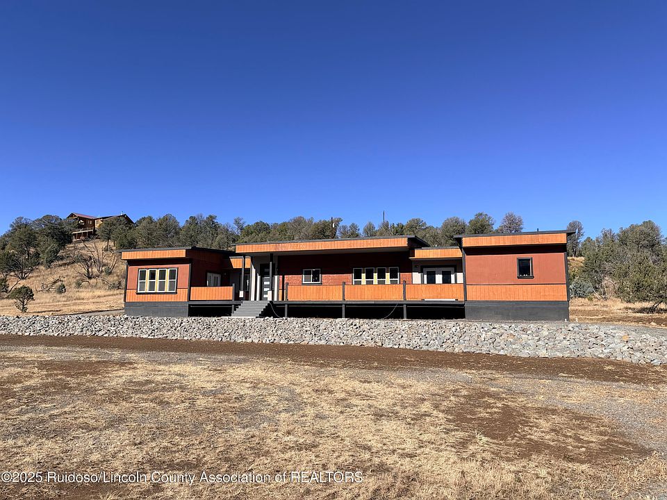 NEW CONSTRUCTION CUSTOM HOME! Mountain retreat one level home with 4BD/4BA (2 master suites) with bonus rooms and a 1BD/1BA detached casita on approximately 5.54 acres with 210' of Rio Bonito River frontage. Nestled amongst nice pasture areas with tree, valley and Capitan views. Also includes a detached approx. 900 sq. ft two car garage with workshop-hobby area. Home offers spacious open concept living with stainless style kitchen appliances, butcher block kitchen countertops, low maintenance covered/uncovered decks, 2 CFA heat/ac units in main home and split unit in casita. Overs luxury, privacy and natural beauty. Gas log fireplace. Abundant wildlife, horses allowed and park privileges too.