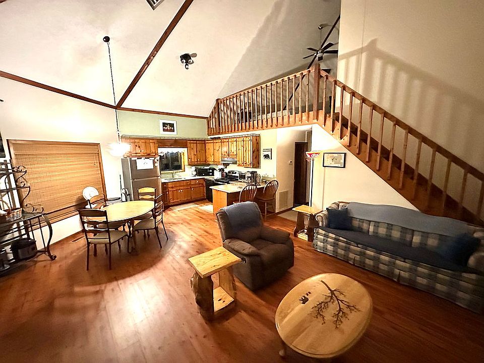 Wood burning stoveOpen floor planGranite countertopsUnderground utilitiesRustic cabin styleGorgeous pine kitchen cabinetsReverse osmosis filter system