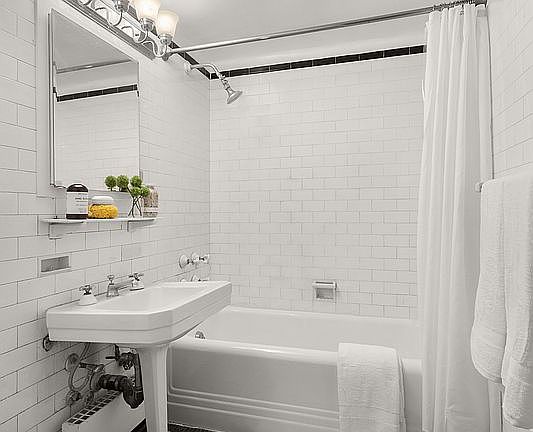 A dressing area off the bathroom provides ample built-in storage, while the original mosaic tile flooring, pedestal sink, cast-iron soaking tub, and medicine cabinet preserve the building’s timeless pre-war character.