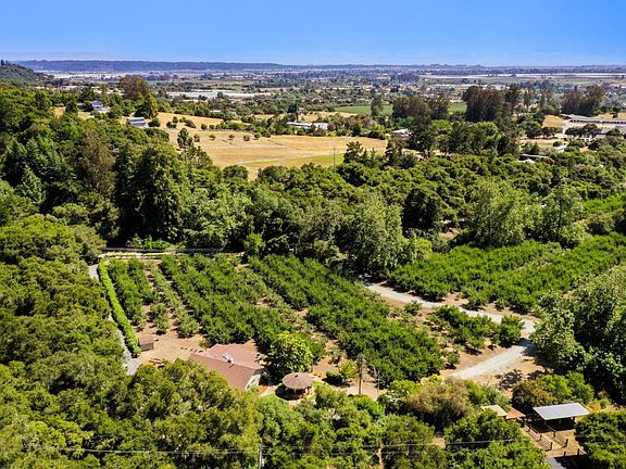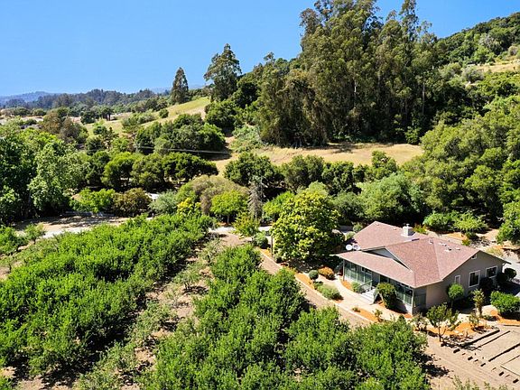 The best of all worlds. A spacious, comfortable 3br, 2.5ba, 1861 sq ft single-level, ranch home on 10 flat and enchanting acres, nestled right in the heart of the Mt Madonna foothills. Long arbored rows of grapes offer a welcome approach and a south-facing, shaded veranda looks peacefully out onto a picturesque landscape of sun, serenity, the soothing sounds of silence and 7 lush acres of ripening apple trees. This is a remarkable opportunity to pursue life's passions and gather the fruits of your labor: small estate/hobby vineyard, apple or olive orchard, chicken coop and generous garden areas. Two small creeks flow through the property and there is a long established ag well that pumps 30gpm, plus an additional fenced pasture area and hay loft that is ideal for horses. Wonderful separation of space. Plenty of room to stretch out and expand your horizons. This feels like the middle of nowhere and the center of everything at the same time. Come for a visit and stay for a lifetime.