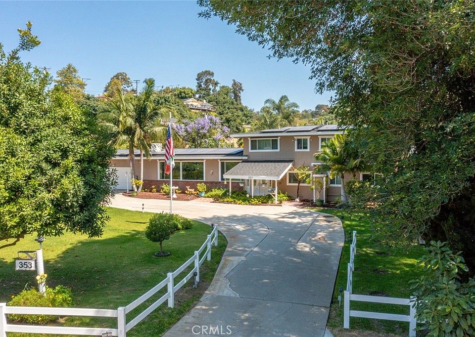 Discover this exquisite La Habra Heights estate sitting on roughly an acre of flat land, featuring a spacious 3,700 sq ft main house and a charming 1,000 sq ft guest house. The meticulously maintained property includes a gated pool and spa with a covered patio, solar panels, a Tuff shed, garden shed, greenhouse, concrete basketball court, and covered RV parking with a 50 amp hookup and drive-over pit for auto enthusiasts. The multi-level main house offers elegant living spaces, including bedrooms and bathrooms on the top floor, a dining room, kitchen, and living room on the middle level, and a family room, kitchenette, bedroom, and bathroom on the lowest level. The guest house is complete with a kitchen, living room, bedroom, bathroom, and laundry. Surrounded by a variety of fruit trees—macadamia nut, avocado, apple, plum, apricot, peach, kumquat, fig, and orange—this estate combines luxury, functionality, and natural beauty.