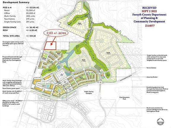 Beautiful estate home with wrap-around porch sitting on level, wooded lot. Also, a potential commercial opportunity for this 2.63+/- acre property with over 300 ft of road frontage on Dahlonega Highway. It is positioned within a strategic carveout surrounded on three sides by the emerging Coal Mountain Town Center, currently under construction. This expansive, master-planned "live, work, play" community will feature a diverse mix of retail, dining, office space, and both rental and for-sale residential units. The development will include more than 700 housing units, comprising 222 single-family homes, 219 townhomes, and 300 apartments. Additionally, over 70,000 square feet of retail space and 20,200 square feet of office space are planned. The design prioritizes green spaces and pedestrian-friendly connections, seamlessly integrating parking lots. The development aims to blend the town's historical charm with a modern, vibrant atmosphere, honoring Coal Mountain's cultural, agricultural, musical, and religious heritage.