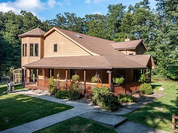 This Home was Custom Built by the Seller's Family and is 2x6 Not 2x4 Construction and is Hitting the Market for the FIRST TIME! Step Into Timeless Charm and Modern Comfort in this Stunning Custom Home Nestled amongst Mature Trees on This Approx. 3.25 Acre Parcel. Designed to Impress, This Home Features in the Living Room a Dramatic Vaulted Ceiling, Floor to Ceiling Windows Offering Picturesque Views of Nature and a Grand Staircase. The Classic Wood-Burning Fireplace Adds to the Ambience with Unique Easy Access on Both sides for Log Storage. Yet Another Feature for Entertaining or Daily Use is a Full Wet Bar. This home Delivers on Functionality and Layout with a BEDROOM and Full BATH and Nice Sized Laundry Room All on the MAIN Level! Enjoy a Cook's Kitchen with Bountiful Cabinetry and Plenty of Counter Space including a Breakfast Nook. Enjoy Dining or Morning Coffee in the Dining Room off the Kitchen Offers Endless Potential and is Partially Finished. There is a Finished Room-Previously Used as a Salon with a Half Bath...Choose Your Use....Could Easily Be Used as an Office, Workout Room, or Media Room. Storage Galore in the Basement Including a Space Which is Perfect for Gardeners or Just Tooling Around or Start a New Hobby! One Less Expense and Thing to Think About..Seller Has Already Equipped this Home with a WHOLE House Generator. Outside, Relax on the EXPANSIVE Wrap-Around Porch or Tend to Your Fenced Garden in a Peaceful, Tree-lined Setting and Get Ready to Enjoy Nature! This One-of-a-Kind Property Offers the Privacy of Country Living with the Convenience of Modern Design. This Home will be a JOY to view and One You Will Be Proud to Call "Home".