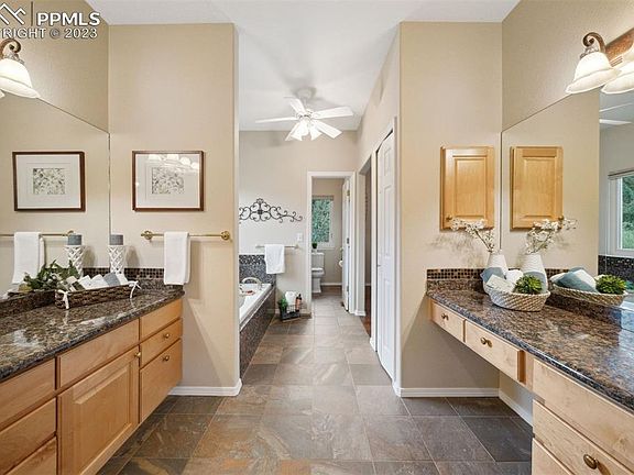 Discover your private oasis in Juniper Ridge at Cedar Heights, a gated community on the west side of Garden of the Gods. This ranch home sits on a 1/2 acre lot with stunning views of Pikes Peak, Cheyenne Mountain and beyond. With five bedrooms, office, five baths, two living spaces and a three-car garage, there's ample space for all. The layout allows natural light to flood in, highlighting the panoramic scenery. An upper deck offers 360-degree views for entertaining, while a covered lower deck and patio provide a serene retreat. A covered front porch beckons relaxation. High ceilings and a gas fireplace create an inviting ambiance in the living and dining areas with engineered hardwood and stone tile flooring throughout the main level. The large kitchen boasts new appliances, maple cabinets, double oven and gas cooktop. Convenience abounds with two laundry rooms and a garage featuring workshop space and built-in storage. Modern upgrades include newer windows and light fixtures. The primary bedroom offers deck access, an ensuite with dual vanities, jetted tub, oversized shower with bench and tile backsplash plus a dressing room. With an HOA that provides 24/7 security plus speedy snow removal of all main roads, embrace luxury, privacy and comfort in this extraordinary ranch home.