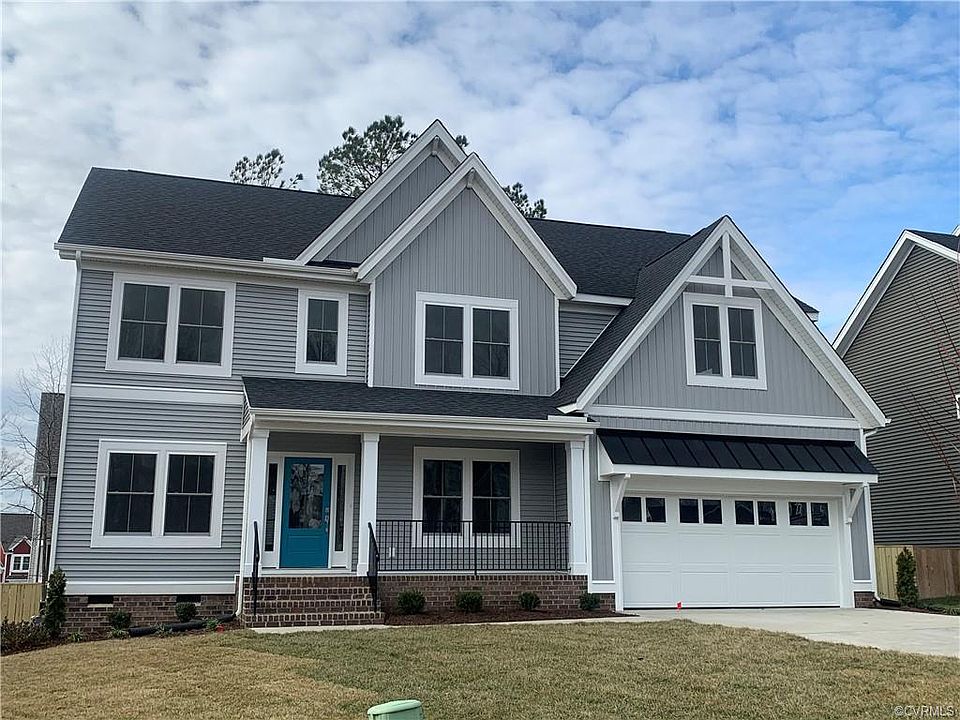 Farmhouse elevation with brick front porch. Formal Dining Room and Study off the foyer. The detail and custom trim work you have come to expect from this builder. Family Room with stained beams in the ceiling and fireplace with built in bookcases. Gourmet kitchen with upgrade Gray Shaker Style cabinetry, granite tops, stainless appliances, large single sink, ceramic backsplash. center work island and designer lighting. Enjoy casual dining in the day room which opens onto the 10 x 18 rear porch. There is a first floor guest suite with full bath. The split landing staircase is stained to match the hardwoods. Upstairs the Owners Suite is AMAZING with sitting area , walk in closets, and private luxurious bath (all done in beautiful tile work.) There are 3 other bedrooms on this level as well as a good size loft. The laundry room is upstairs too for added convenience. You will love the walk up attic which is great for storage. Enjoy living in Rountrey with all the amenities you can call home. Pictures are from builder's library of this plan. Home is scheduled for completion July.