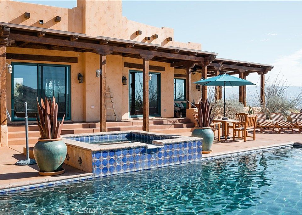 Welcome to The Ocotillo House, a luxury hacienda located in the Tubb Canyon area of Borrego Springs. Situated on 19.97 acres accessible from a private road, the home is set amidst an old Ocotillo forest bordering Anza Borrego State Park. Meticulously designed, the 2800+ square foot estate is a visual delight providing natural beauty and simplistic luxury that embraces the Sonoran Desert lifestyle. You enter through an antique Mexican gate into a central, fountained courtyard. The 2300 square foot main house features a large open floor plan, high beamed cathedral ceilings and panoramic views. The 2 en-suite bedrooms are quiet sanctuaries opening to the peaceful courtyard with views of Indian Head. The primary suite features its own private patio with desert views in every direction, including from the step-in shower in the expansive primary bath. Mix up happy hour cocktails at the bar while watching the game, enjoy gatherings around the central fireplace, prepare holiday dinners in the well-equipped kitchen or al fresco suppers on the BBQ. The Ocotillo House is perfect for relaxing with friends and family. The outdoors are brought in from the many large well-placed windows and glass doors throughout. Outside, large covered verandas wrap the home creating several outdoor living, dining and conversation spaces, and heated pebble tech pool and hot tub, provide ample places to enjoy the breathtaking views. The 2-bedroom 1 bath detached Casita provides an additional 500 square feet of space and offers a harmonious retreat for guests with its own covered veranda and seating areas. The rooftop viewing deck is the perfect place to catch the sunset over Indian Head or check out the Milky Way after dark. Tucked away in its own private oasis, The Ocotillo House is still just minutes from downtown Borrego Springs, restaurants, hiking trails and the award-winning Rams Hill Golf Course. This estate is offered fully furnished including rare, high-end and/or antique pieces acquired from around the world, making it the perfect turnkey full-time home or desert getaway you’ve dreamed of. The Ocotillo House is currently a Five Star rated, part-time Airbnb. Producing approximately $70,000 in annual revenue from occasional short-term rentals, it provides the ability to enjoy a second home for little to no cost, or a burgeoning opportunity to produce substantially higher income. No HOA dues. Owned solar system. Imported Spanish tiles in kitchen and baths and so much more.