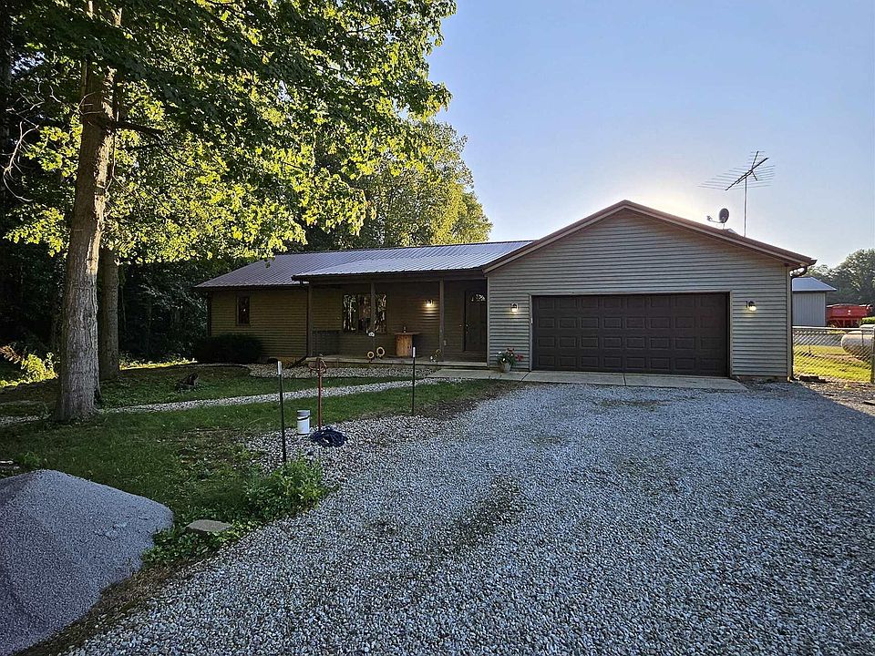 Lovely country home featuring 3 bedroom 2 full baths, tray ceiling in kitchen paired with built in oven and cooktop range, sitting on a serene .67 acre setting with trees and fenced in back yard, rear wood deck that can be shaded for your comfort by the attached automatic awning. Newer metal roof, updated/remodeled master bath, open floor plan, gas log freestanding fireplace, whole home Generac generator that automatically activates with loss of power. All appliances in home stay with the exception of the washer and dryer. Huge 20x26 great room with lots of natural light in the home. Garage fridge, freezer and safe are NOT included with sale of home. Shrubs, storage shed and west fence are west property line. Propane tank is north of the property line. Written encroachment agreement with neighbors allow this encroachment as long owner provides water and electric to the neighbor's pole barn. Please see attached documents for more details. Will provide a 12 month history of electric bills from Tipmont.