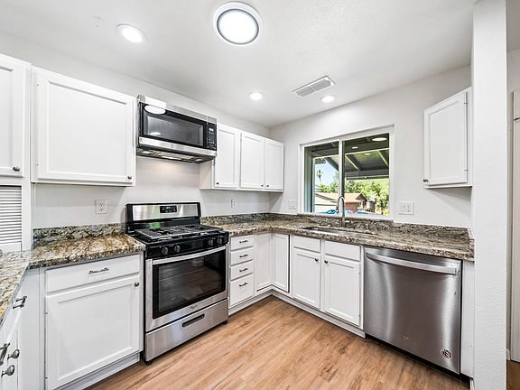 Highly Upgraded Redding Home sits on a cul-de-sac street with front porch views of Mt. Shasta! In the Kitchen: brand new granite counter tops, stainless steel sink, ample cabinetry + a pantry & new stainless steel appliances. Luxury Vinyl Plank Floors throughout + new carpet in all the bedrooms. The 4th Bedroom has its own separate entrance, perfect for a home office or den. All the bedrooms feature mirrored closet doors! The Master is a true ''suite'' with its own private sitting room, 2 closets: a walk-in closet with built-in storage shelves & shoe racks + a separate closet. The Master Bath is amazing featuring tile floors, dual sink vanity with new granite counters, plus a separate traditional vanity, big double door walk-in shower + a door to the patio which would be perfect for spa!