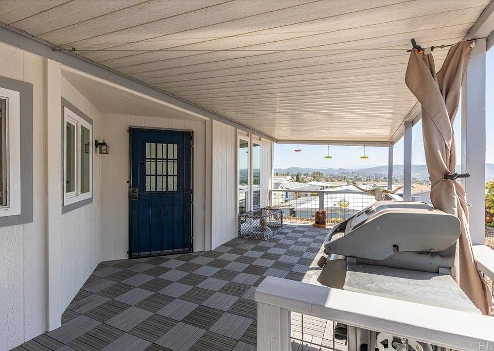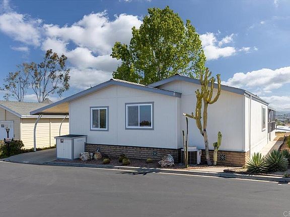 Beautifully remodeled 3 section home that sits high on top of a cul-de-sac street within in Rancho Vallecitos; a resort style 55+ community that is very social & active and has rent control! VIEWS from every direction; Sunrises, city lights, mountains, and winter snow caps can be enjoyed from your deck and Living room windows, while sunsets and a peekaboo ocean view can be enjoyed from the Primary Bedroom! The shed has been improved to be the max legal size and features an automatic garage door and can fit a motorcycle. The home has many other special upgrades including dual pane windows, refinished ceilings, custom interior doors and finishes, a newer 40 gallow water heater, updated Kitchen and Bathrooms, butcher block counters, wet bar, LED lights, and more! There is a spacious Living room with vaulted ceilings and high windows, as well as an additional Family room / Den and wet bar. The Primary Bedroom features a huge walk in closet and ensuite Bathroom with large custom shower and tub. The Guest Bedrooms has been converted to an office and also has it’s own ensuite Bathroom. The Utility Room is larger than most with extra space to double as an office work space. Convenient to guest parking. Monthly space rent is $740 per month and is under city rent control. 1 dog, or 1 dog & 1 cat, or 2 cats okay if < 20 lbs / no dog walking or permanent pet fencing allowed in park. There is a large dog park within this community just down the street from this home that you are allowed to walk your dog to. Age 55+ (2nd resident can be 45+), must be owner occupied.