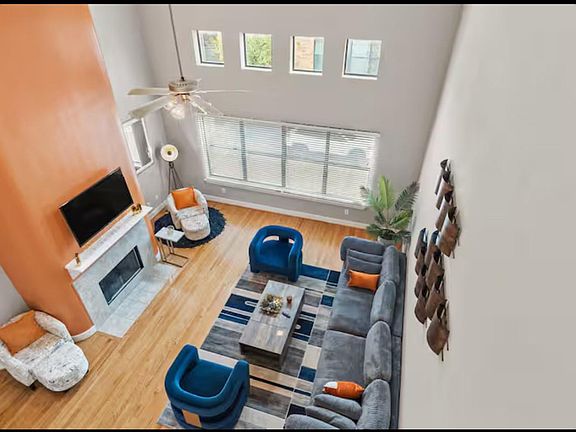 Cozy fireplaceElegant finishesHigh ceilingsAbundant natural lightTile flooringGranite countertopsLarge walk-in closet