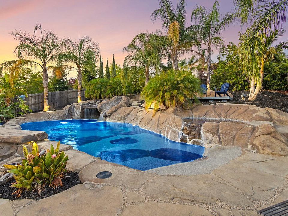 Never before on market, this Blackstone retreat blends elegance with resort living. Designed to live like a single story, the primary suite rests on the lower level, while the upstairs has been reimagined to include 4 bedrooms and a tranquil study alcove that inspires creative focus. A custom ADU (constructed in 2021) features a private office and outdoor bath. The backyard unfolds as a private paradise that features an incredible saltwater pool with a zero beach entry, swim-up bar, surreal grotto, waterfall features, natural waterslide, and spa, framed by custom lighting for those special evenings. An outdoor kitchen with expansive bar seating sets the stage for gatherings, surrounded by mature palms and tropical landscape promotes elevated living. Sited on a .27-ACRE homesite, this staycation lifestyle invites effortless comfort and entertainment. Built with energy efficient features that include a 38-panel SOLAR SYSTEM, EV charger, tankless water heater and more. Residents of Blackstone enjoy exclusive access to the clubhouse, fitness center, pools, trails, parks, and 24-hr security. Top-rated schools include Valley View Charter K-8, just a short walk away. This ultimate staycation embodies pure abundance.