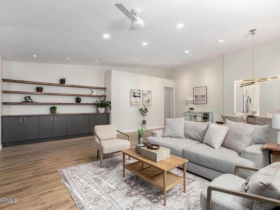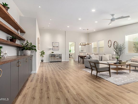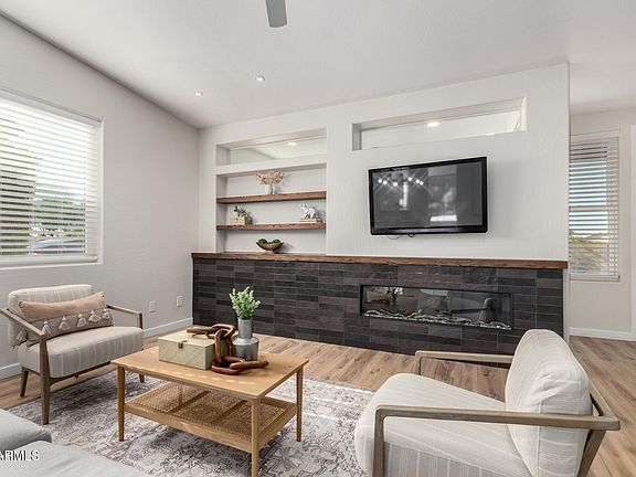 Tucked beneath vibrant Red Mountain, this charmingly renovated home's bright, OPEN FLOOR PLAN is flooded with natural light bouncing off its SOARING VAULTED CEILINGS. Step out to the PRIVATE BACKYARD with large covered patio, mature shade trees and lush turf. The single level floor plan flows effortlessly into its generous 3 bedrooms + BONUS OFFICE/DEN (it could even serve as a 4th bedroom)! Luxurious primary suite with spa-like bathroom: freestanding soaking tub, dual vanities and large walk-in closet. DESIGNER TOUCHES THROUGHOUT: fireplace, quartz counters (even the bath vanities), low-E dual-pane windows * doors, water softener and recessed lighting. Mountain views, nearby hiking, convenient commutes on the freeways, shopping and LOW HOA fees. Come check this stunning home out today!