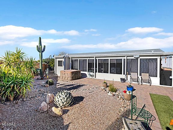 Beautiful mostly furnished 3 bedroom 2 bath home on curve in road with a two car garage. Private backyard with patio space and hot tub. AZ room extends across entire back of home and includes a portable AC unit. Newer roof, tankless water heater, HVAC serviced annually, and whole house water softener. Renovated kitchen with granite counter tops. Laminate floor in home only 3 years old. Most of the windows have been replaced and include plantation shutters. Current termite warranty in place. Must see this one! Copper Crest is a gated Active Adult Community which includes swimming, spa, shuffleboard, pool table, work-out facility, hiking and biking, and more. And, all within a short distance of Tucson. And you own the land!