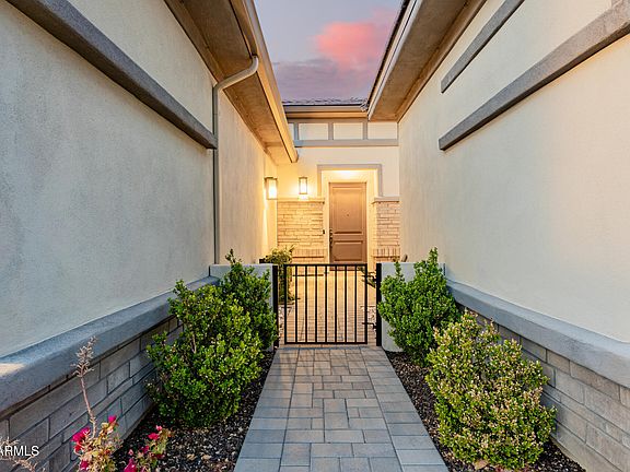 This stunning home delivers the perfect blend of luxury, space, & lifestyle. Set on a quarter-acre lot in a private gated community, it welcomes you with a charming courtyard entry and a flexible floor plan designed for the way you live. Inside, soaring 12- & 10-foot ceilings create an open, airy feel throughout. The gourmet kitchen is an entertainer's dream, featuring a massive island, granite slab counters with a sleek glass backsplash, 42'' cabinets with crown molding, stainless steel appliances including a gas cooktop with hood, double ovens, & a built-in microwave. The great room's 4-panel sliding glass door opens to an extended covered patio—ideal for indoor-outdoor living. The spacious owner's suite offers a spa-like experience with a tiled walk-in shower & large walk-in closet... ...while the oversized secondary bedrooms provide plenty of comfort for family or guests. Step outside to your backyard retreat with a heated pool and spa, outdoor fireplace, flagstone patio, and synthetic grass play area with trampoline.
