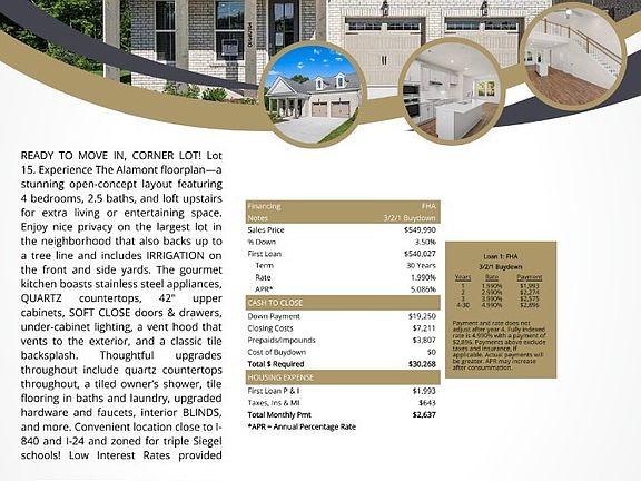 READY TO MOVE IN, CORNER LOT! Lot 15. Experience The Alamont floorplan—a stunning open-concept layout featuring 4 bedrooms, 2.5 baths, and loft upstairs for extra living or entertaining space. Enjoy nice privacy on the largest lot in the neighborhood that also backs up to a tree line and includes IRRIGATION on the front and side yards. The gourmet kitchen boasts stainless steel appliances, QUARTZ countertops, 42" upper cabinets, SOFT CLOSE doors & drawers, under-cabinet lighting, a vent hood that vents to the exterior, and a classic tile backsplash. Thoughtful upgrades throughout include quartz countertops throughout, a tiled owner’s shower, tile flooring in baths and laundry, upgraded hardware and faucets, interior BLINDS, and more. Convenient location close to I-840 and I-24 and zoned for triple Siegel schools! Low Interest Rates provided offered through builder's preferred lender.