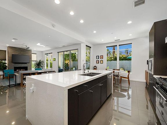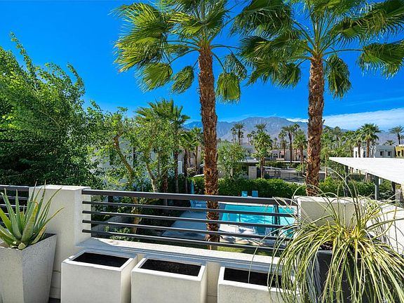 Don't pay new construction prices -- instead, buy in this modern gated community that feels brand new, while enjoying that Palm Springs vibe... without the Palm Springs price tag. Wake up to the majestic San Jacinto Mountains and the soothing sight of mature trees that bring texture, privacy, and shade for those warm desert days. With a 360-degree panorama of mountain vistas, this home was designed to celebrate its stunning surroundings. Your private gated courtyard sets the tone -- peaceful, welcoming, and the perfect spot to enjoy your morning coffee or watch your pets play in the sunshine. Step inside and experience over $70,000 in thoughtful upgrades throughout this open-concept living space. Just move right in. You'll love the cozy fireplace, custom window treatments, and walls of glass that fill the home with natural light. Need a guest room or home office? There's a convenient bedroom and bath downstairs -- complete with generous closet and storage space. Upstairs, retreat to your spacious primary suite with its own private balcony(one of only two in the community) and spectacular west and southwest mountain views. Enjoy a spa-like shower and an oversized wardrobe closet. Down the hall, another bedroom with a wall of closets opens to a balcony where you can take in more of those unforgettable views. Step outside to your private backyard oasis -- lush landscaping, a sparkling pool, covered patio, and serene views. And when you'd rather not heat your own pool, take advantage of the adjacent community pool and spa. All this just minutes from downtown Palm Springs, the airport, Trader Joe's, and everything the valley has to offer. Why pay more for new construction when you can have this move-in-ready gem -- stylish, modern, and perfectly priced. Your desert Zen lifestyle starts right here. Additional features and upgrades: high ceilings and 24-inch porcelain floor tiles, great room with remote activated fireplace, large dining space, stylish kitchen complete with premium Bertazzoni appliances, quartz countertops, large kitchen island, custom window treatments, a tankless water heater, two-zoned AC system, extra storage, and direct access two-car garage. Community amenities include a sparkling pool, spa and dog park.