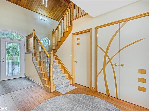 Nestled on a private road, this stunning 2-storey home offers unparalleled lakeside living. Set on a deep lot stretching almost 300 feet, the property features extensive hardscaping & mature landscaping for privacy & natural beauty. As you enter, a welcoming foyer leads you into the expansive 2-storey great room. Here, a vaulted ceiling, a wood-burning fireplace, & large windows frame breathtaking lake views, creating an inviting atmosphere. This space seamlessly flows into the renovated kitchen & breakfast room, where you'll find high-end appliances, a coffee station, & a large island perfect for culinary adventures. From here, step out onto the back deck to enjoy barbecues or unwind with an evening cocktail. The main floor also features a generous dining room, a convenient mudroom with outside access & a dog washing station, & a 2-piece bath. Upstairs, the primary bedroom is a true sanctuary, offering a private balcony overlooking the water & an ensuite bath. Two additional family bedrooms & a 3-piece bath provide ample space for family & guests. The fully finished basement extends the living space with 3 additional bedrooms, a large multi-purpose room, a 3-piece bath, & a spacious utility room. The true highlight of this home is its stunning backyard, starting at the large deck, perfect for entertaining or simply soaking up to sun. Follow the walkway down to the boathouse, complete with marine rails & ample storage for all your watercraft. The boathouse also features a seating area on the upper level, offering another spot to enjoy the stunning views. The lower terraces provide additional seating areas & gardening space, leading to a large dock where you can launch your boat for lake adventures. This exceptional waterfront home combines luxury, comfort, & nature. Don’t miss the opportunity to make this dream home your reality. *Private road fee of $500/yr *Access to communal raquet court membership for community members