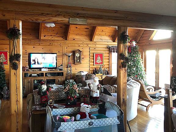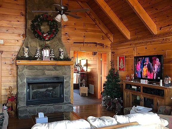 Log home construction...vaulted and large beamed wooden ceiling. Huge stone fireplace in great room. Million dollar views of mountains and city area.