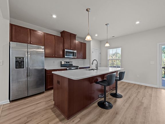 Stunning luxury end-unit TH. Prime location. 8 miles from DT Raleigh, near Wake Tech CC, shopping, dining, & entertainment. Convenient & tranquil. In back of subd. Private/Serene views. Like you're on vacation. Sought-after McCullers Walk. Resort-style amenities : heated indoor pool, outdoor pool, fitness center, dog park, pet spa, clubhouse & game room, tennis/basketball courts. Thoughtfully designed floorplan has gourmet kitchen, open layout to family perfect for entertaining. Lower: flex room & access to patio. Main: Bright dining area, chef's kitchen, family room, & half bath. Deck to enjoy beautiful, unobstructed views. Upper: Large primary w/walk-in closet, 2 additional bedrooms, full bathroom, true laundry room. Fresh paint work, washer, dryer, & fridge. Guest parking available. Low HOA's. No need for gym membership.