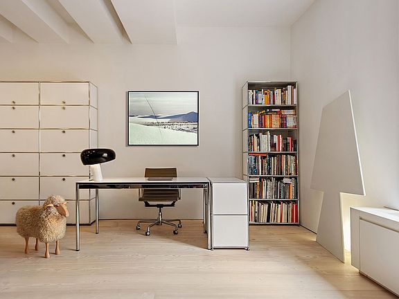 Upon entering, you are greeted by the warm elegance of Dinesen Douglas fir wood flooring, with its striking 12-inch-wide planks that seamlessly anchor the living space. The room is enhanced by Dominique Kieffer curtain partitions, creating soft visual boundaries while maintaining an open and airy flow. Custom Vistoe shelving lines the walls, providing sleek and versatile storage options.