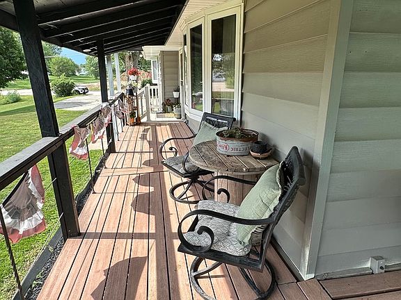 Over 1/2 acre with spacious ranch style home in town! The newly added wrap around front porch invites you in & provides extended living space outdoors. Great for relaxing or entertaining with the adjacent patio. The bright living room is generous in size & has a new gas fireplace. The eat-in kitchen has a new hood, faucet, backsplash and more updates. All 3 bedrooms on main level have lovely hardwood floors and plenty of room. There is a full bath just off the master bedroom. Potential for laundry to be added to main floor. The basement is perfect for hanging out in the family room with electric fireplace & 2nd kitchen area. There are 2 partially finished non-conforming bedrooms, plus storage, laundry, & 1/2 bath. Lots of garage space! 2 car attached with heat and a 1 car detached garage.