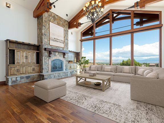 Sprawling luxury estate with majestic views at the award-winning Redlands Mesa Golf Course! Situated on 2 combined lots, this iconic craftsman stone and wood home with over 6,100sf, was constructed with views of the Grand Valley and Colorado National Monument in mind. Splendid grandeur exudes as you enter the large foyer that leads you to the heart of the home. The gourmet kitchen with built-in breakfast nook, walk-in pantry, 2 islands, 2 sinks and desk area opens up to a 2 story great room with a full height stone fireplace, stately timber trusses, cathedral ceilings and a wall of windows. The designer renovated primary suite is a one-of-a kind sanctuary with three separate yet adjoining areas including 3 fireplaces, double closets, laundry area, modern kitchenette and a luxurious spa-like bathroom. Four bedrooms with adjoining bathrooms, oversized mudroom, office and dining area are just some of the many features throughout the sizeable home. The walk out basement includes a full kitchen, bathroom and laundry area that opens up to the in-ground pool, several tiered patios and fireplace with stunning views.