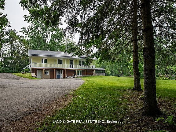 Nestled on 11.584 acres (per GeoWarehouse), this 3+2 bedroom, 2 bath raised bungalow offers the perfect blend of comfort, space, and sustainability. Step inside to a bright, open-concept main floor featuring a family-sized kitchen with abundant cupboards, a separate large pantry counter space, custom blinds, and a breakfast bar all open to a spacious dining room with additional custom blinds, a walkout to the backyard deck, all graced with laminate floors & pine wainscotting around the walls. The sun-filled living room boasts laminate flooring and seamless flow from kitchen to conversation. Main floor bathroom freshly painted with a brand new tub surround. Retreat to generous bedrooms with ample closet space, or head downstairs to the fully finished walkout lower level complete with 2 additional bedrooms, a cozy WETT-certified wood stove, custom built-in entertainment unit/Home Theater featuring, Samsung 85 LED TV, Harmon Kardon 7:1 surround, and Polk Audio in-wall speakers. A 3pc bathroom and large laundry/utility room complete the lower level. Outside, discover your own slice of country bliss with covered run-in paddock, chicken coop with run, a screened gazebo with a metal roof, detached 1.5 car garage with hydro, lots of perennial gardens, and a tree-lined driveway. Across the road are scenic hiking trails, and you're just 5 minutes to amenities in Tweed!