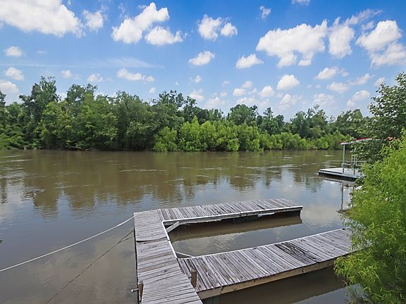 Welcome to this beautifully appointed 3-bedroom, 2-bath riverfront retreat?where timeless charm meets modern convenience. Nestled along the water's edge, this elevated home offers panoramic river views and a private boat slip just steps from your door. Inside, you'll find warm hardwood floors throughout and striking tongue-and-groove ceilings that add rustic character and charm. Natural light pours in from large windows and sliding glass doors, filling the open living area with a bright, airy feel. The living space flows effortlessly onto a screened porch and open deck?perfect for entertaining or enjoying peaceful mornings watching the water. The kitchen features a gas range, ample cabinetry, and great workspace for preparing meals with ease. A stackable washer and dryer add functionality without sacrificing space. The main level includes a spacious master suite with en suite bath, a welcoming guest room, and a second full bath. Upstairs, a cozy loft/bunk room provides extra sleeping or hangout space with a view. The home's elevated design offers covered parking below, ideal for gatherings or additional storage. A Generac whole-home generator ensures comfort and security year-round. A detached 12 x 20 storage building and large pole barn provide ample space for your boat, mower, tools, and outdoor gear. Whether you're looking for a weekend getaway, vacation rental, or full-time waterfront haven?this property delivers the perfect balance of comfort, character, and lifestyle.