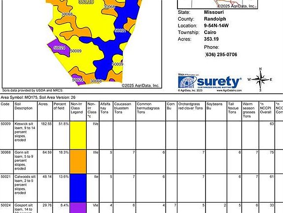 353.8 ac Surveyed acres Randolph County. Farm is currently in pasture, owner putting farm in row crop & is willing to rent it back at $250 per tillable acre. Owner is projecting that there will be approximately 304 acres tillable. There is a 4-5 acre pond in the Southeast section of the Farm. Priced at $7200 per acre