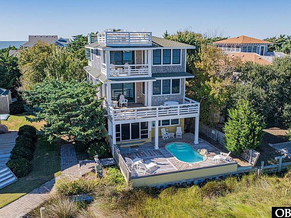 The first level offers a spacious King ensuite with a private bath and a cozy den with kitchenette that flows onto the screened porch and out to the pool deck. The mid-level is the heart of the home, where everyone gathers to take in the views and enjoy time together. Upstairs, you’ll find two more King ensuites, each with private baths and shared deck access with amazing Silver Lake views. A convenient wet bar leads to a covered porch and a spiral staircase that brings you to the rooftop lookout—an unforgettable spot offering 360° views of Silver Lake, the sound, and the iconic Ocracoke Lighthouse. It’s the kind of place where mornings start with coffee and seabirds, and evenings end with glowing sunsets over the water.