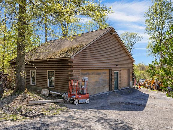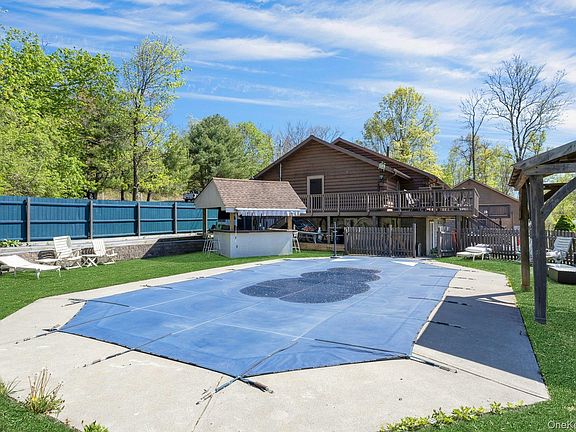 Don't miss this incredible opportunity to live the vacation lifestyle every day. This unique Original Lincoln Log cabin offers a seamless blend of rustic charm and modern updates, set on three private acres with stunning mountainside views. The heart of the home is a beautifully updated open kitchen featuring an island, breakfast bar, two pantry closets, and direct access to the expansive full length deck-perfect for indoor-outdoor living. A separate dining area and a soaring cathedral-ceiling family room with a striking stone fireplace create a warm and inviting atmosphere for entertaining and everyday living. The main level includes two spacious bedrooms, an updated bath, and a private primary suite with a fully renovated ensuite bath and direct access to the deck. The lower level offers even more space to spread out and enjoy, with a large entertainment room that opens to the backyard, a full bath, a generous laundry area with built-in cabinetry, an ice maker and a private office with sliding glass doors. Step outside into your personal outdoor oasis featuring a built-in pool, hot tub, full bar, putting green, bocce ball court and horseshoe area - designed for year-round enjoyment. A massive detached 35' x 36' garage with loft space adds unmatched storage and versatility. This property is truly one-of-a-kind retreat designed for comfort, entertainment and unforgettable memories.